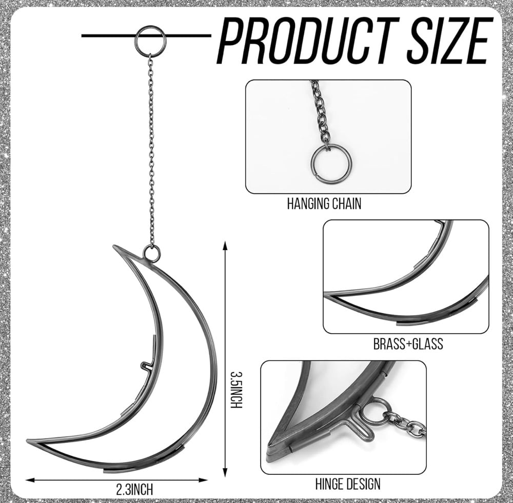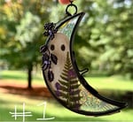 Whimsical crescent moon suncatcher featuring a hand-painted ghost, real pressed flowers, and suncatcher film that creates beautiful light effects. Complete with hand-beaded accent vine and ready-to-hang design.